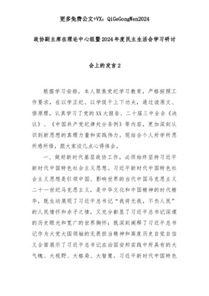 【七哥公文】2025年:政协副主席在理论中心组暨2024年度民主生活会学习研讨会上的发言2+更多免费公文+VX:QiGeGongWen2024+更多免费公文+VX:QiGeGongWen2024