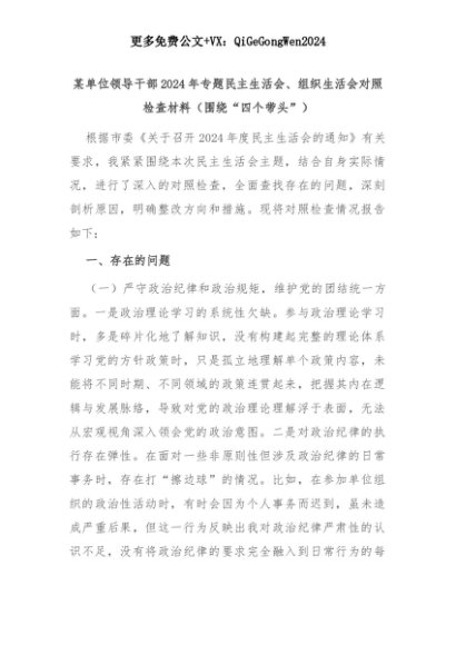 【七哥公文】2025年:某单位领导干部2024年专题民主生活会、组织生活会对照检查材料(围绕“四个带头”)+更多免费公文+VX:QiGeGongWen2024+更多免费公文+VX:QiGeGongWen2024