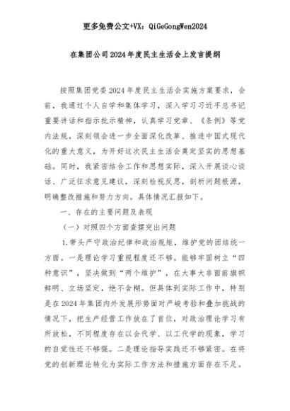 【七哥公文】2025年:在集团公司2024年度民主生活会上发言提纲+更多免费公文+VX:QiGeGongWen2024+更多免费公文+VX:QiGeGongWen2024