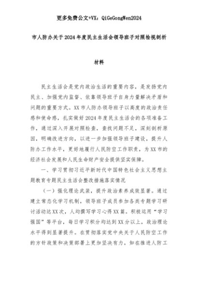 【七哥公文】2025年:市人防办关于2024年度民主生活会领导班子对照检视剖析材料+更多免费公文+VX:QiGeGongWen2024+更多免费公文+VX:QiGeGongWen2024