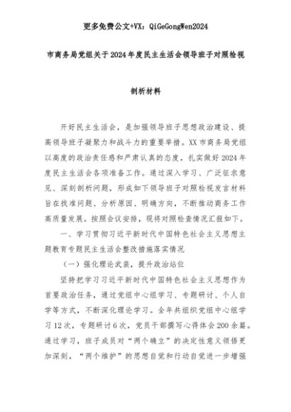 【七哥公文】2025年:市商务局党组关于2024年度民主生活会领导班子对照检视剖析材料+更多免费公文+VX:QiGeGongWen2024+更多免费公文+VX:QiGeGongWen2024