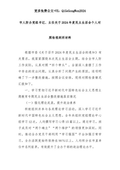 【七哥公文】2025年:市人防办党组书记、主任关于2024年度民主生活会个人对照检视剖析材料+更多免费公文+VX:QiGeGongWen2024+更多免费公文+VX:QiGeGongWen2024