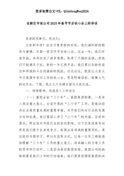 【七哥公文】2025年:在新区市政公司2025年春节节后收心会上的讲话+更多免费公文+VX:QiGeGongWen2024+更多免费公文+VX:QiGeGongWen2024