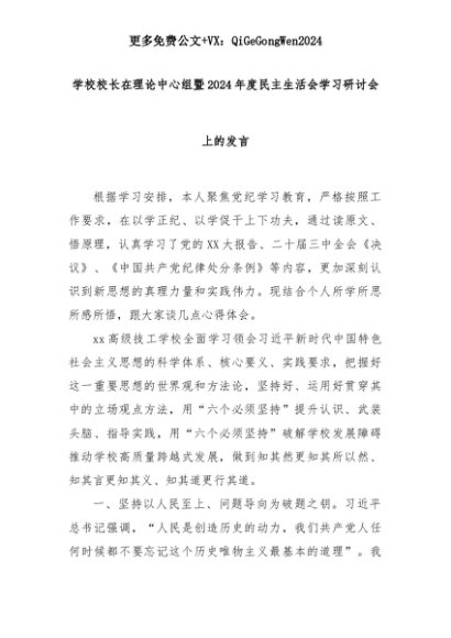 【七哥公文】2025年:学校校长在理论中心组暨2024年度民主生活会学习研讨会上的发言+更多免费公文+VX:QiGeGongWen2024+更多免费公文+VX:QiGeGongWen2024