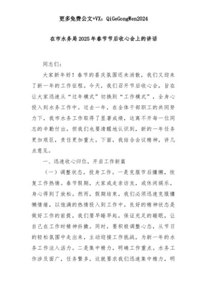 【七哥公文】2025年:在市水务局2025年春节节后收心会上的讲话+更多免费公文+VX:QiGeGongWen2024+更多免费公文+VX:QiGeGongWen2024