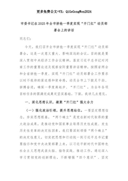 【七哥公文】2025年:市委书记在2025年全市拼抢一季度实现“开门红”动员部署会上的讲话+更多免费公文+VX:QiGeGongWen2024+更多免费公文+VX:QiGeGongWen2024