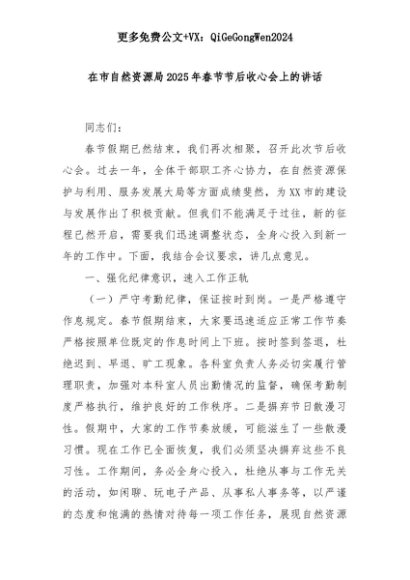 【七哥公文】2025年:在市自然资源局2025年春节节后收心会上的讲话+更多免费公文+VX:QiGeGongWen2024+更多免费公文+VX:QiGeGongWen2024
