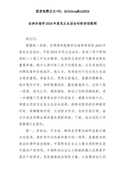 【七哥公文】2025年:在参加指导2024年度民主生活会时的讲话提纲+更多免费公文+VX:QiGeGongWen2024+更多免费公文+VX:QiGeGongWen2024