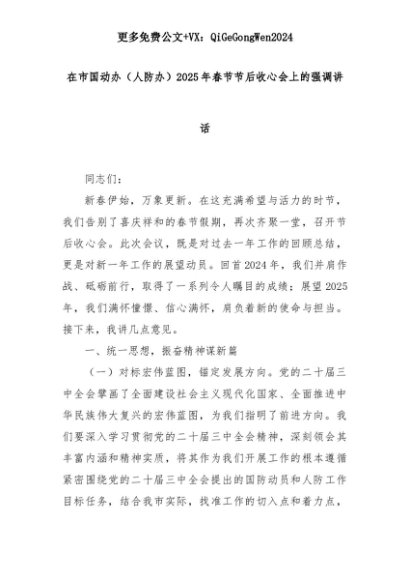 【七哥公文】2025年:在市国动办(人防办)2025年春节节后收心会上的强调讲话+更多免费公文+VX:QiGeGongWen2024+更多免费公文+VX:QiGeGongWen2024