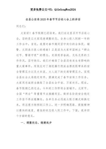 【七哥公文】2025年:在县公安局2025年春节节后收心会上的讲话+更多免费公文+VX:QiGeGongWen2024+更多免费公文+VX:QiGeGongWen2024