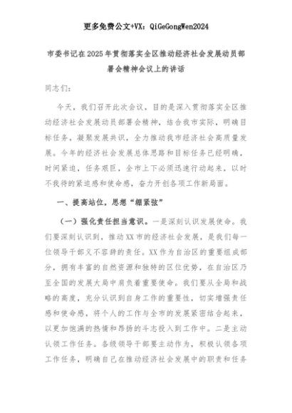 【七哥公文】2025年:市委书记在2025年贯彻落实全区推动经济社会发展动员部署会精神会议上的讲话+更多免费公文+VX:QiGeGongWen2024+更多免费公文+VX:QiGeGongWen2024