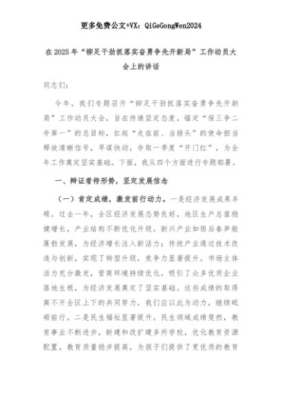 【七哥公文】2025年:在2025年“铆足干劲抓落实奋勇争先开新局”工作动员大会上的讲话+更多免费公文+VX:QiGeGongWen2024+更多免费公文+VX:QiGeGongWen2024