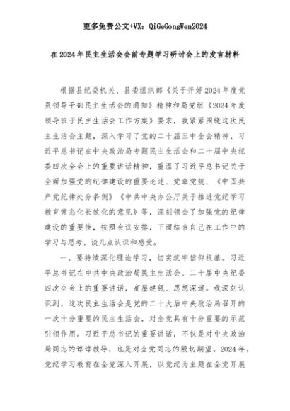 【七哥公文】2025年:在2024年民主生活会会前专题学习研讨会上的发言材料+更多免费公文+VX:QiGeGongWen2024+更多免费公文+VX:QiGeGongWen2024