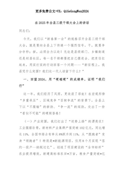 【七哥公文】2025年:在2025年全县三级干部大会上的讲话+更多免费公文+VX:QiGeGongWen2024+更多免费公文+VX:QiGeGongWen2024