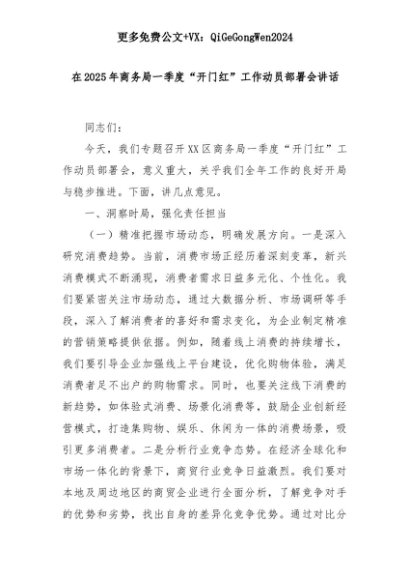 【七哥公文】2025年:在2025年商务局一季度“开门红”工作动员部署会讲话+更多免费公文+VX:QiGeGongWen2024+更多免费公文+VX:QiGeGongWen2024