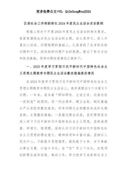【七哥公文】2025年:区委社会工作部副部长2024年度民主生活会发言提纲+更多免费公文+VX:QiGeGongWen2024+更多免费公文+VX:QiGeGongWen2024