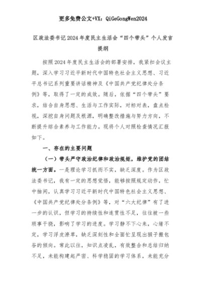 【七哥公文】2025年:区政法委书记2024年度民主生活会“四个带头”个人发言提纲+更多免费公文+VX:QiGeGongWen2024+更多免费公文+VX:QiGeGongWen2024