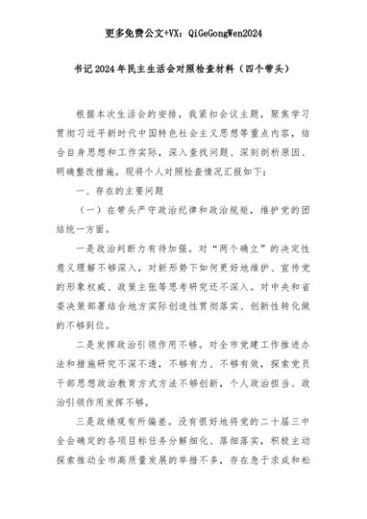 【七哥公文】2025年:书记2024年民主生活会对照检查材料(四个带头)+更多免费公文+VX:QiGeGongWen2024+更多免费公文+VX:QiGeGongWen2024
