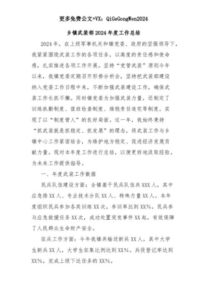 【七哥公文】2025年:乡镇武装部2024年度工作总结+更多免费公文+VX:QiGeGongWen2024+更多免费公文+VX:QiGeGongWen2024