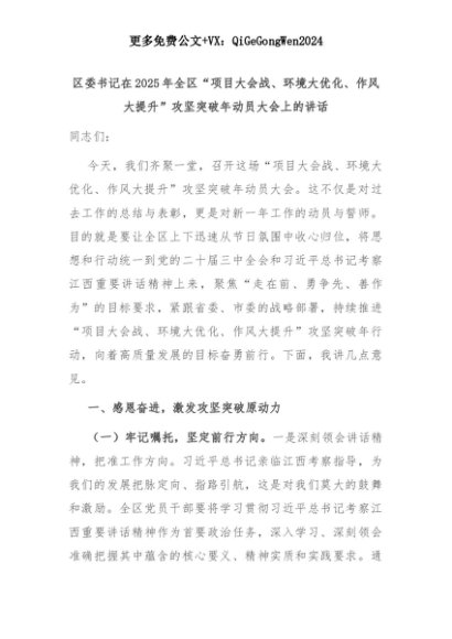 【七哥公文】2025年:区委书记在2025年全区“项目大会战、环境大优化、作风大提升”攻坚突破年动员大会上的讲话+更多免费公文+VX:QiGeGongWen2024+更多免费公文+VX:QiGeGongWen2024