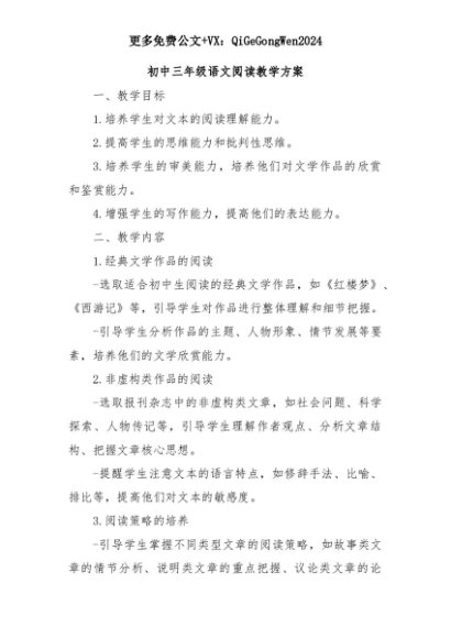 【七哥公文】2025年:初中三年级语文阅读教学方案+更多免费公文+VX:QiGeGongWen2024+更多免费公文+VX:QiGeGongWen2024
