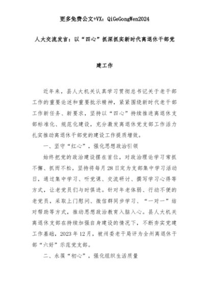 【七哥公文】2025年:人大交流发言:以“四心”抓深抓实新时代离退休干部党建工作+更多免费公文+VX:QiGeGongWen2024+更多免费公文+VX:QiGeGongWen2024