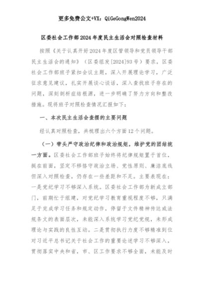 【七哥公文】2025年:区委社会工作部2024年度民主生活会对照检查材料+更多免费公文+VX:QiGeGongWen2024+更多免费公文+VX:QiGeGongWen2024