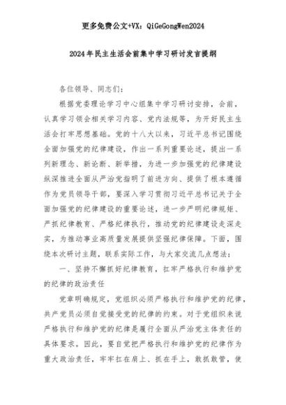 【七哥公文】2025年:2024年民主生活会前集中学习研讨发言提纲+更多免费公文+VX:QiGeGongWen2024+更多免费公文+VX:QiGeGongWen2024