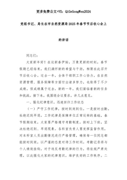 【七哥公文】2025年:党组书记、局长在市自然资源局2025年春节节后收心会上的讲话+更多免费公文+VX:QiGeGongWen2024+更多免费公文+VX:QiGeGongWen2024