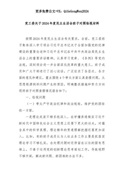 【七哥公文】2025年:党工委关于2024年度民主生活会班子对照检视材料+更多免费公文+VX:QiGeGongWen2024+更多免费公文+VX:QiGeGongWen2024