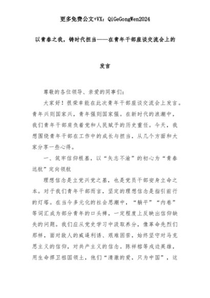 【七哥公文】2025年:以青春之我,铸时代担当——在青年干部座谈交流会上的发言+更多免费公文+VX:QiGeGongWen2024+更多免费公文+VX:QiGeGongWen2024