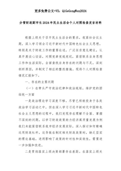 【七哥公文】2025年:分管财政副市长2024年民主生活会个人对照检查发言材料+更多免费公文+VX:QiGeGongWen2024+更多免费公文+VX:QiGeGongWen2024