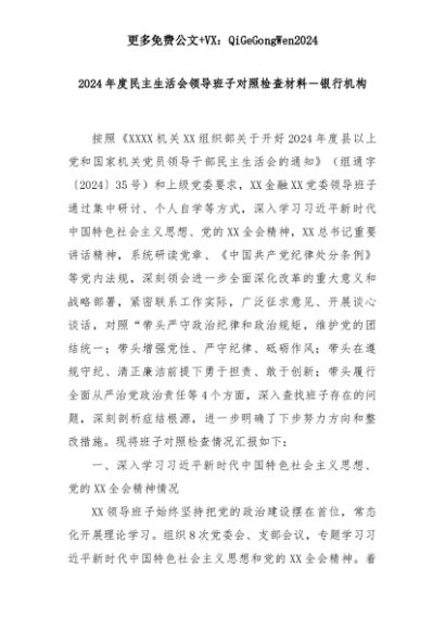 【七哥公文】2025年:2024年度民主生活会领导班子对照检查材料-银行机构+更多免费公文+VX:QiGeGongWen2024+更多免费公文+VX:QiGeGongWen2024