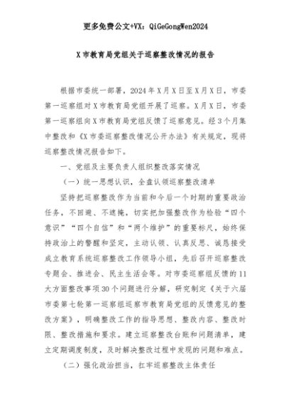 【七哥公文】2025年:X市教育局党组关于巡察整改情况的报告+更多免费公文+VX:QiGeGongWen2024+更多免费公文+VX:QiGeGongWen2024