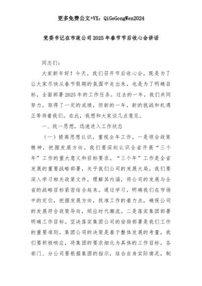 【七哥公文】2025年:党委书记在市政公司2025年春节节后收心会讲话+更多免费公文+VX:QiGeGongWen2024+更多免费公文+VX:QiGeGongWen2024