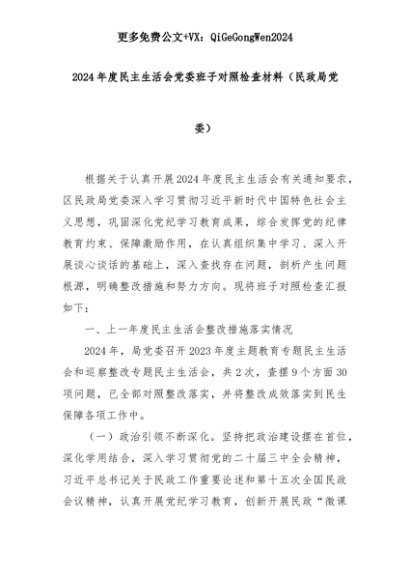 【七哥公文】2025年:2024年度民主生活会党委班子对照检查材料(民政局党委)+更多免费公文+VX:QiGeGongWen2024+更多免费公文+VX:QiGeGongWen2024