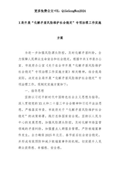 【七哥公文】2025年:X局开展“化解矛盾风险维护社会稳定”专项治理工作实施方案+更多免费公文+VX:QiGeGongWen2024+更多免费公文+VX:QiGeGongWen2024