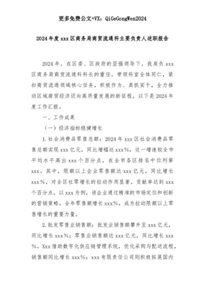 【七哥公文】2025年:2024年度xxx区商务局商贸流通科主要负责人述职报告+更多免费公文+VX:QiGeGongWen2024+更多免费公文+VX:QiGeGongWen2024
