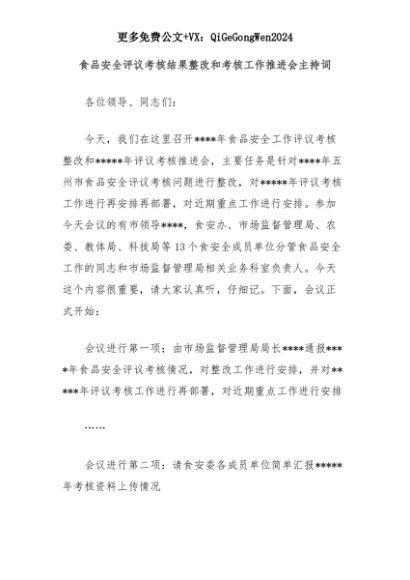 【七哥公文】2025年:食品安全评议考核结果整改和考核工作推进会主持词+更多免费公文+VX:QiGeGongWen2024+更多免费公文+VX:QiGeGongWen2024