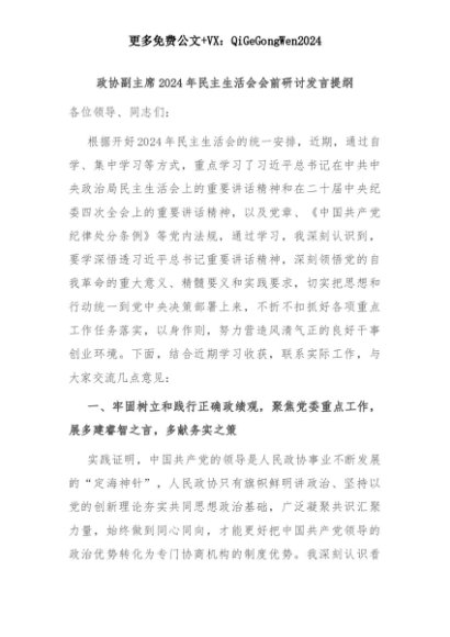 【七哥公文】2025年:政协副主席2024年民主生活会会前研讨发言提纲+更多免费公文+VX:QiGeGongWen2024+更多免费公文+VX:QiGeGongWen2024