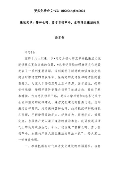 【七哥公文】2025年:廉政党课:警钟长鸣,勇于自我革命,永葆清正廉洁的政治本色+更多免费公文+VX:QiGeGongWen2024+更多免费公文+VX:QiGeGongWen2024