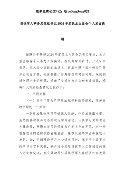 【七哥公文】2025年:退役军人事务局党组书记2024年度民主生活会个人发言提纲+更多免费公文+VX:QiGeGongWen2024+更多免费公文+VX:QiGeGongWen2024