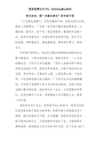 【七哥公文】2025年:研讨发言:做”沙漠红柳式”的年轻干部+更多免费公文+VX:QiGeGongWen2024+更多免费公文+VX:QiGeGongWen2024