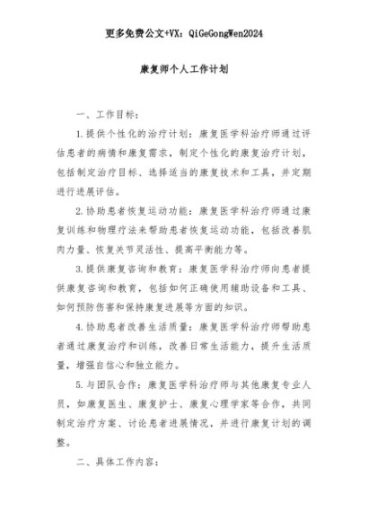 【七哥公文】2025年:康复师个人工作计划+更多免费公文+VX:QiGeGongWen2024+更多免费公文+VX:QiGeGongWen2024