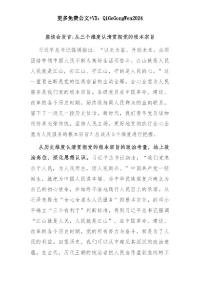 【七哥公文】2025年:座谈会发言从三个维度认清贯彻党的根本宗旨+更多免费公文+VX:QiGeGongWen2024+更多免费公文+VX:QiGeGongWen2024
