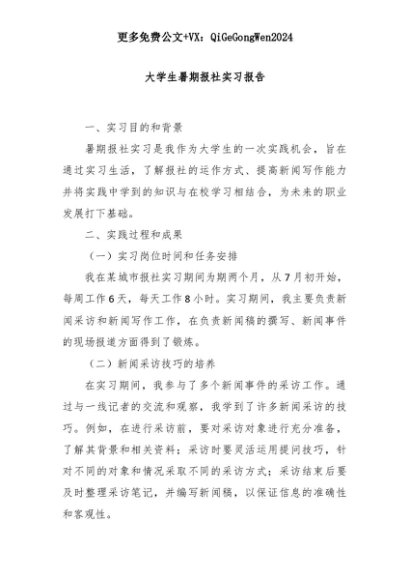 【七哥公文】2025年:大学生暑期报社实习报告+更多免费公文+VX:QiGeGongWen2024+更多免费公文+VX:QiGeGongWen2024