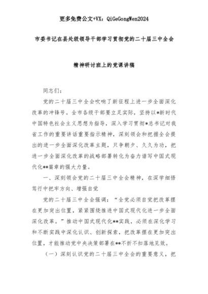 【七哥公文】2025年:市委书记在县处级领导干部学习贯彻党的二十届三中全会精神研讨班上的党课讲稿+更多免费公文+VX:QiGeGongWen2024+更多免费公文+VX:QiGeGongWen2024