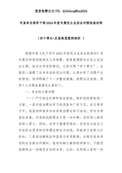 【七哥公文】2025年:市直单位领导干部2024年度专题民主生活会对照检查材料(四个带头+反面典型案例剖析 )+更多免费公文+VX:QiGeGongWen2024+更多免费公文+VX:QiGeGongWen2024