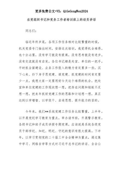 【七哥公文】2025年:在党组织书记和党务工作者培训班上的动员讲话+更多免费公文+VX:QiGeGongWen2024+更多免费公文+VX:QiGeGongWen2024