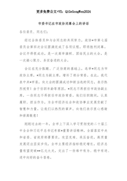 【七哥公文】2025年:市委书记在市政协闭幕会上的讲话+更多免费公文+VX:QiGeGongWen2024+更多免费公文+VX:QiGeGongWen2024